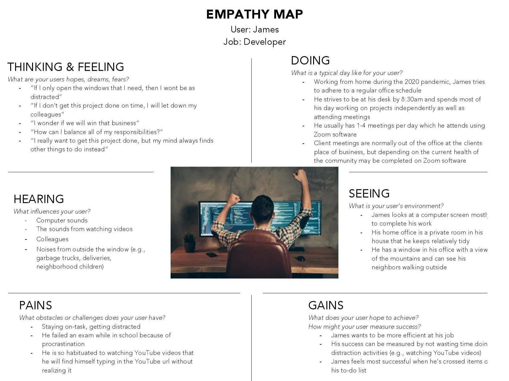 I was tasked with creating an empathy map to help better understand the user, their problems and mindset. Data collected from an interview and survey were used to create the empathy map below for the user “James” who worked as a computer developer.